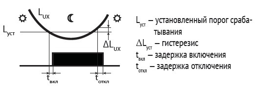 Для защиты от ложных срабатываний при случайном освещении или затемнении фотодатчика предусмотрена задержка времени выключения и включения, соответственно.